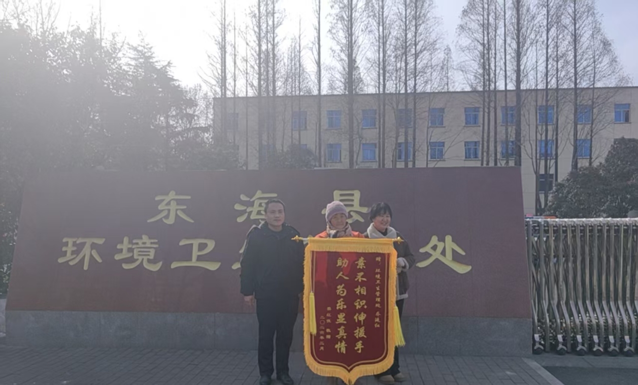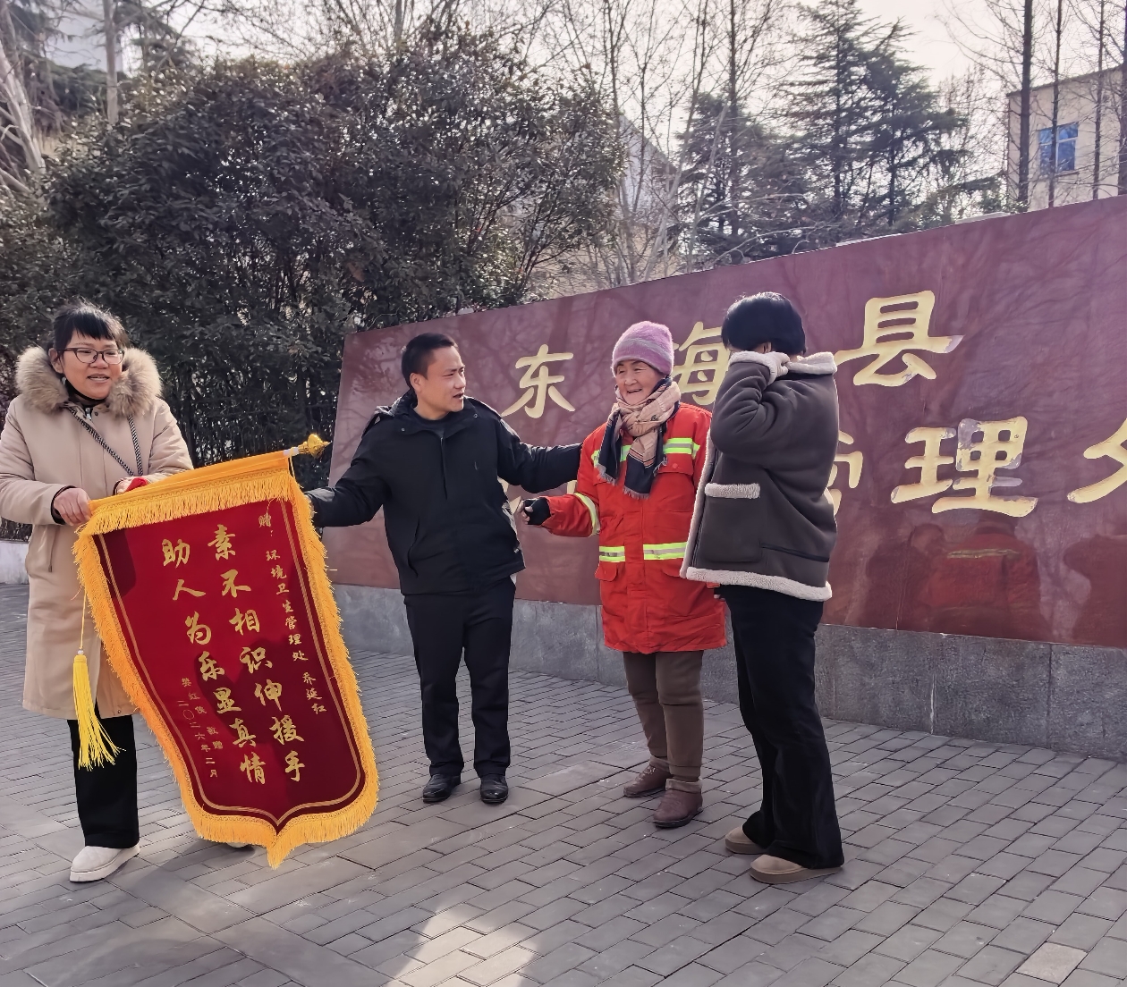 2月9日上午,江苏省东海县福旺家园市民樊女士将一面写有“素不相识伸援手、助人为乐显真情”的锦旗,送到东海县环卫处环卫保洁员乔延红手中,对她拾金不昧的高尚品德由衷感谢,樊女士感激之情溢于言表。