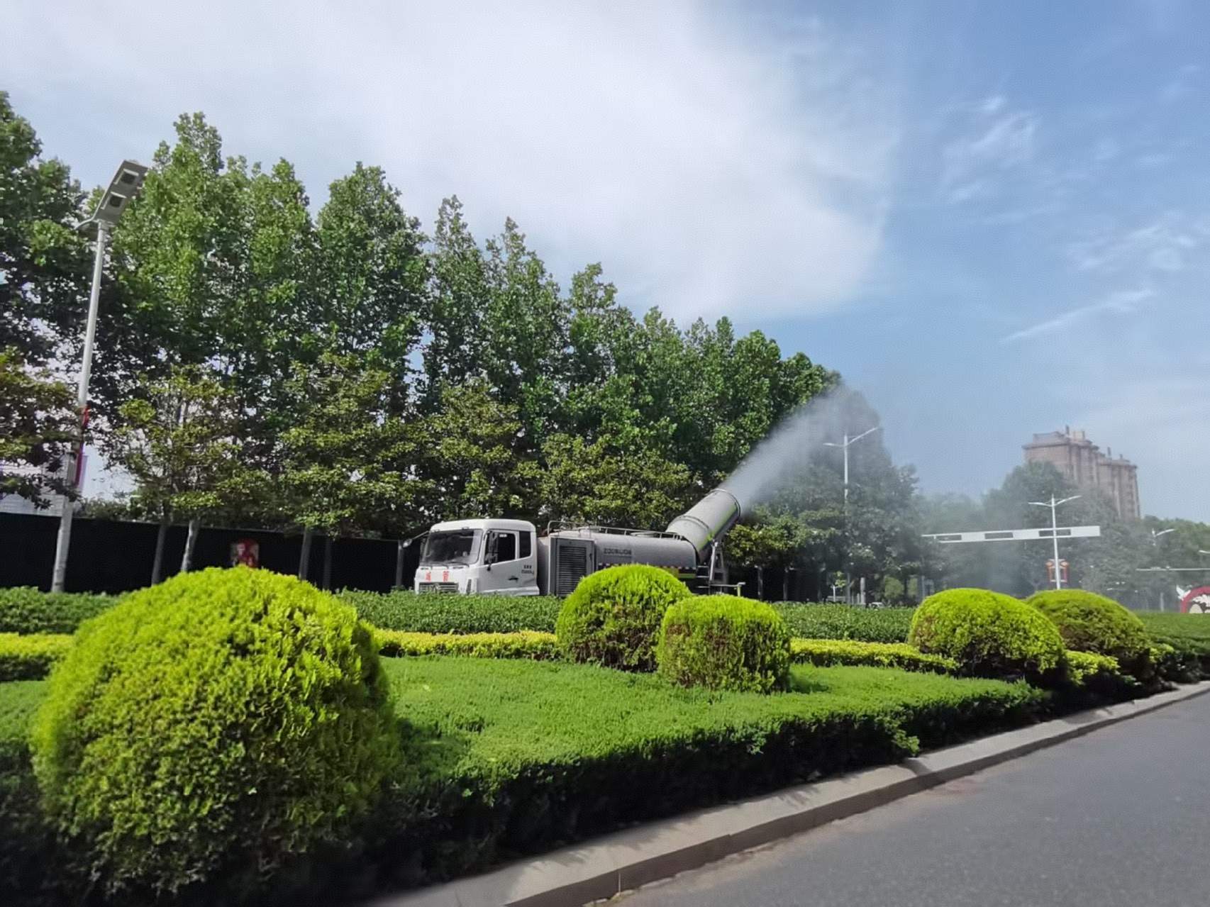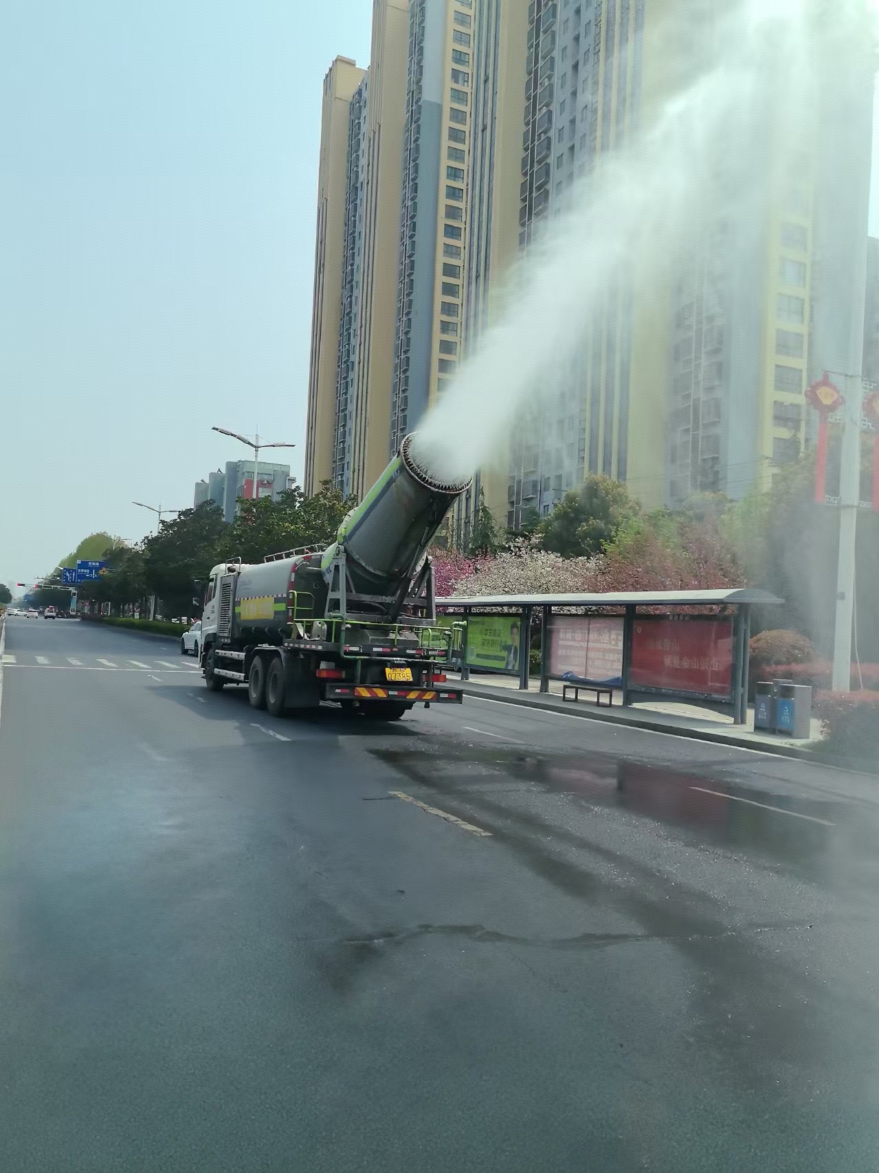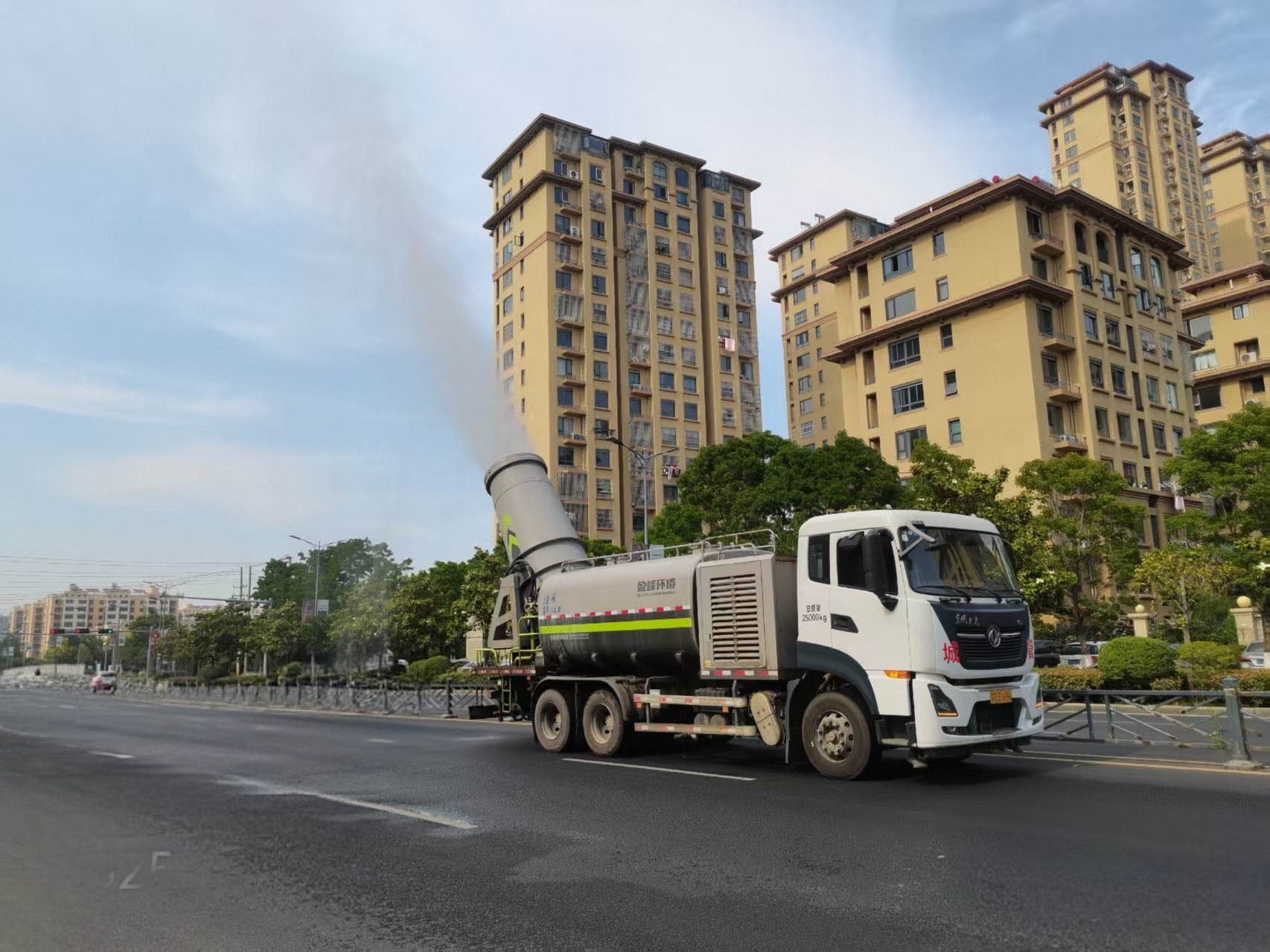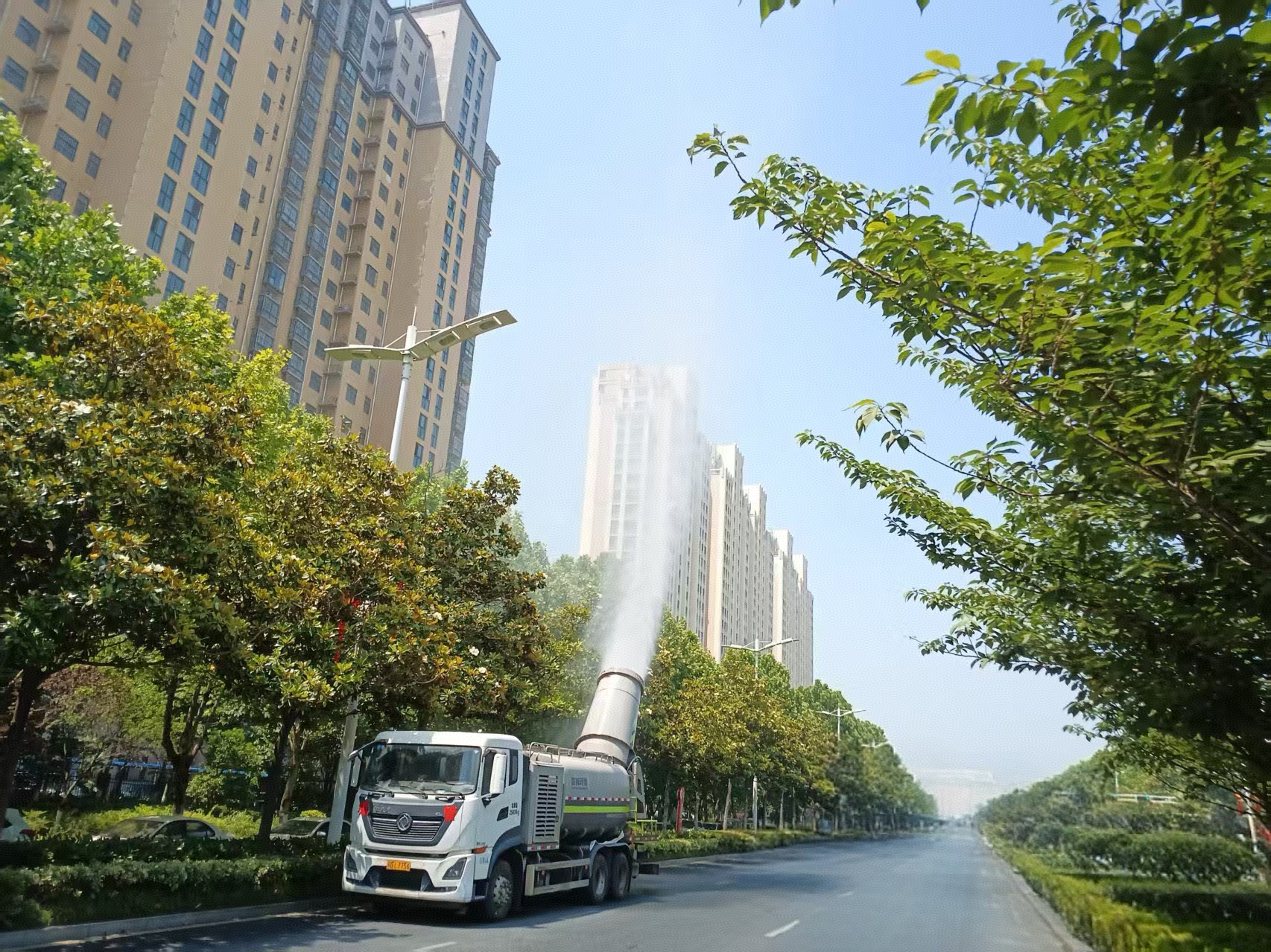 入夏以来,在江苏省东海县城区的街道上,居民经常可以见到有几辆尾部装有“炮筒”样式的卡车,在城区主干道循环进行喷雾作业,每经一处,它便张开“大口”,喷出极为细小的水雾颗粒,飞扬的尘土也乖乖地臣服,特别在这炎热季节,给行人带来清爽的感觉。“这个大家伙,像“大炮”一样好奇特啊!”不少居民纷纷驻足观看,并拿出手机拍照。这就是该县城管局为了优化城市降尘防尘、抑扬治污染,投入资金购置的4辆新式武器“雾炮车”。