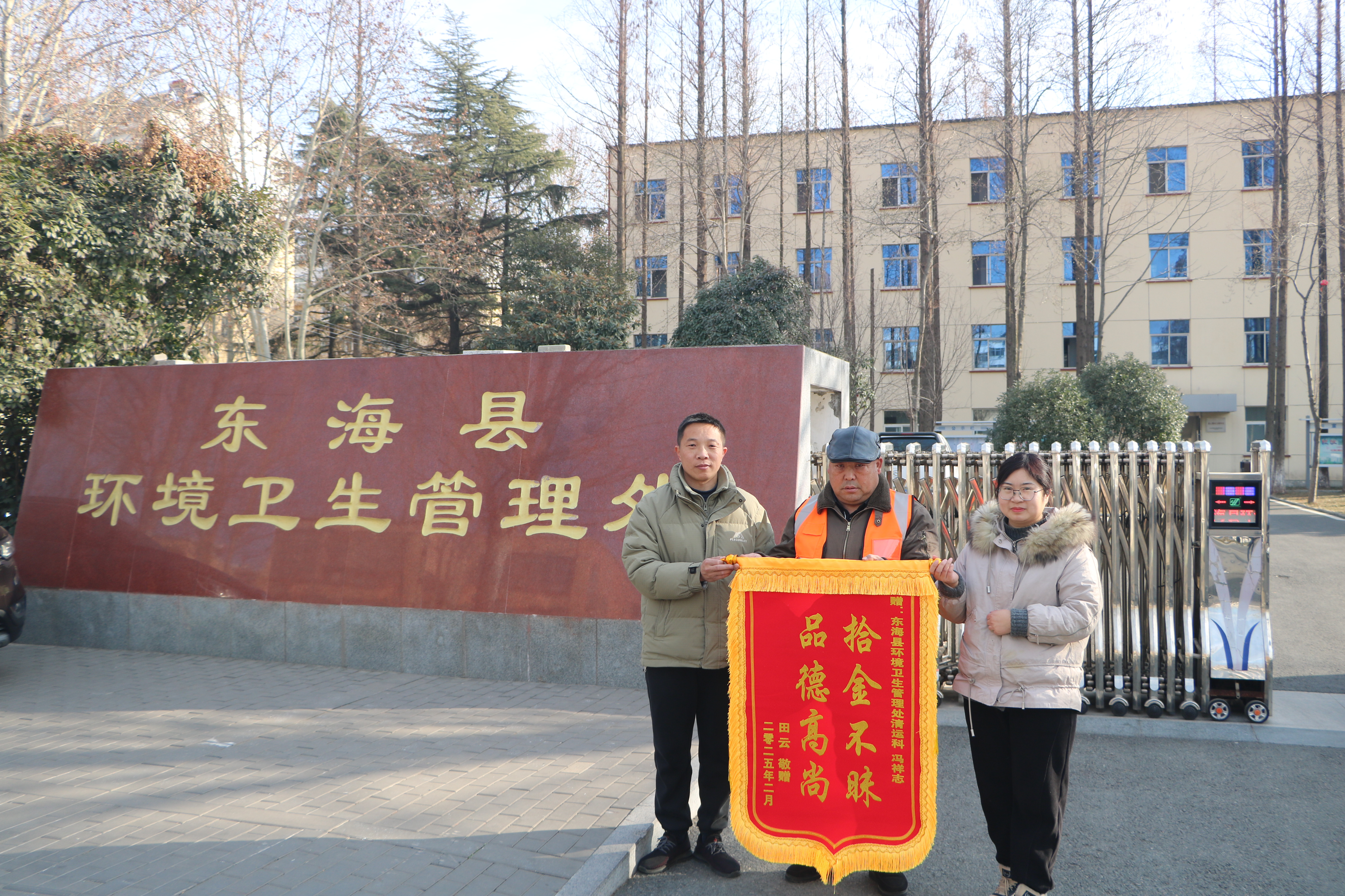 日前,东海县牛山街道英疃村田云特意制作了一面写着“拾金不昧,品德高尚”的锦旗,以此来表达对东海县环卫处环卫工人冯祥志的感激之情。