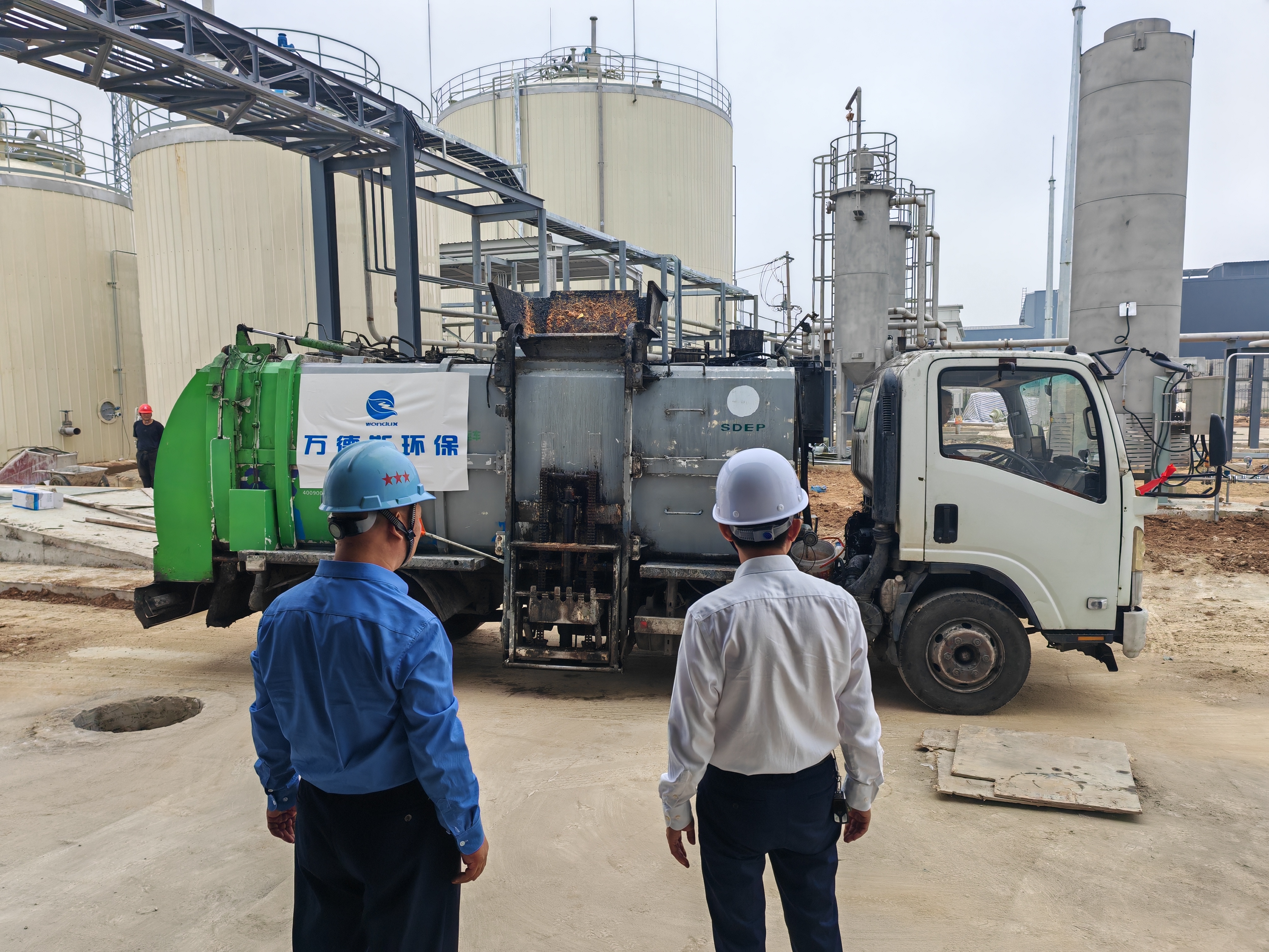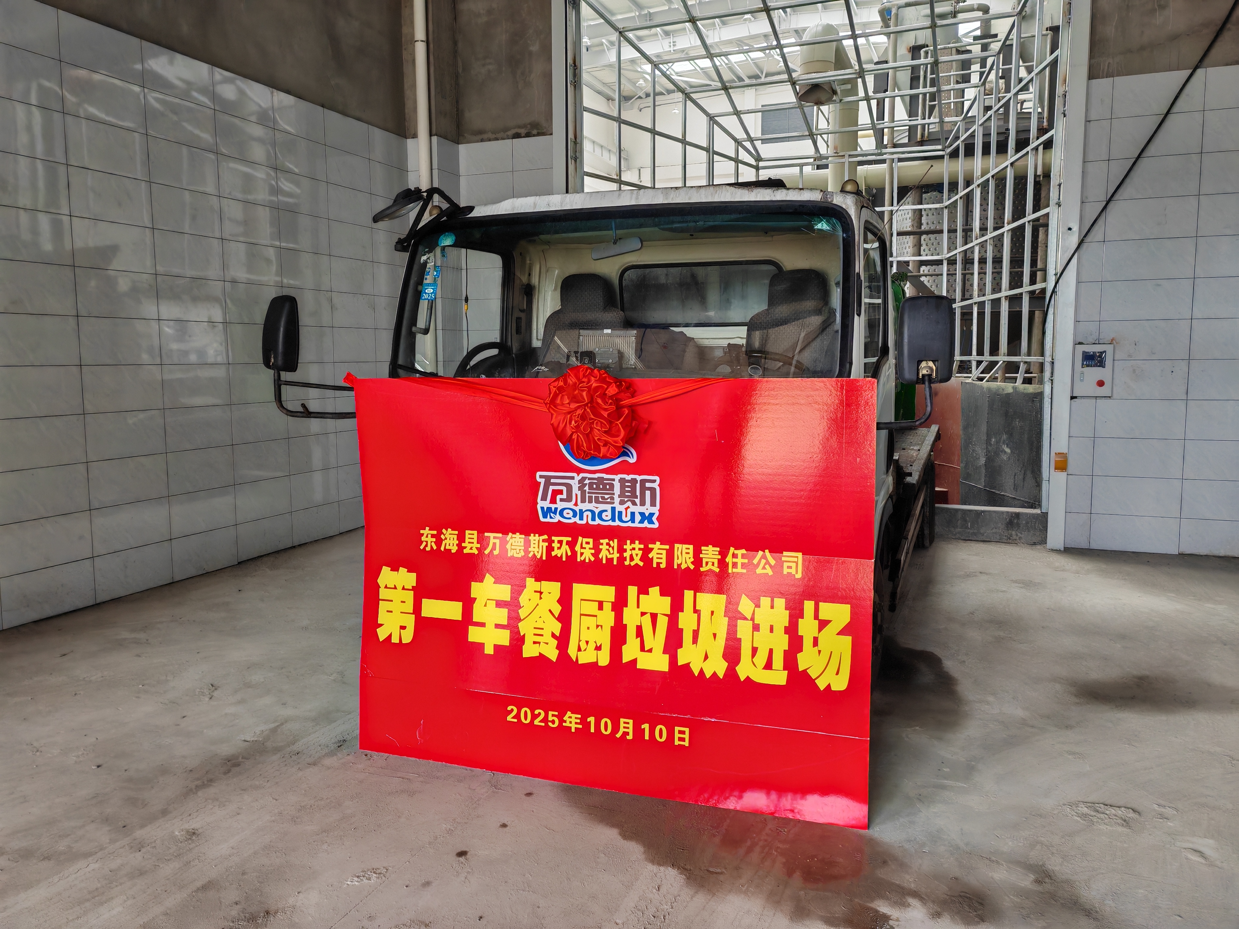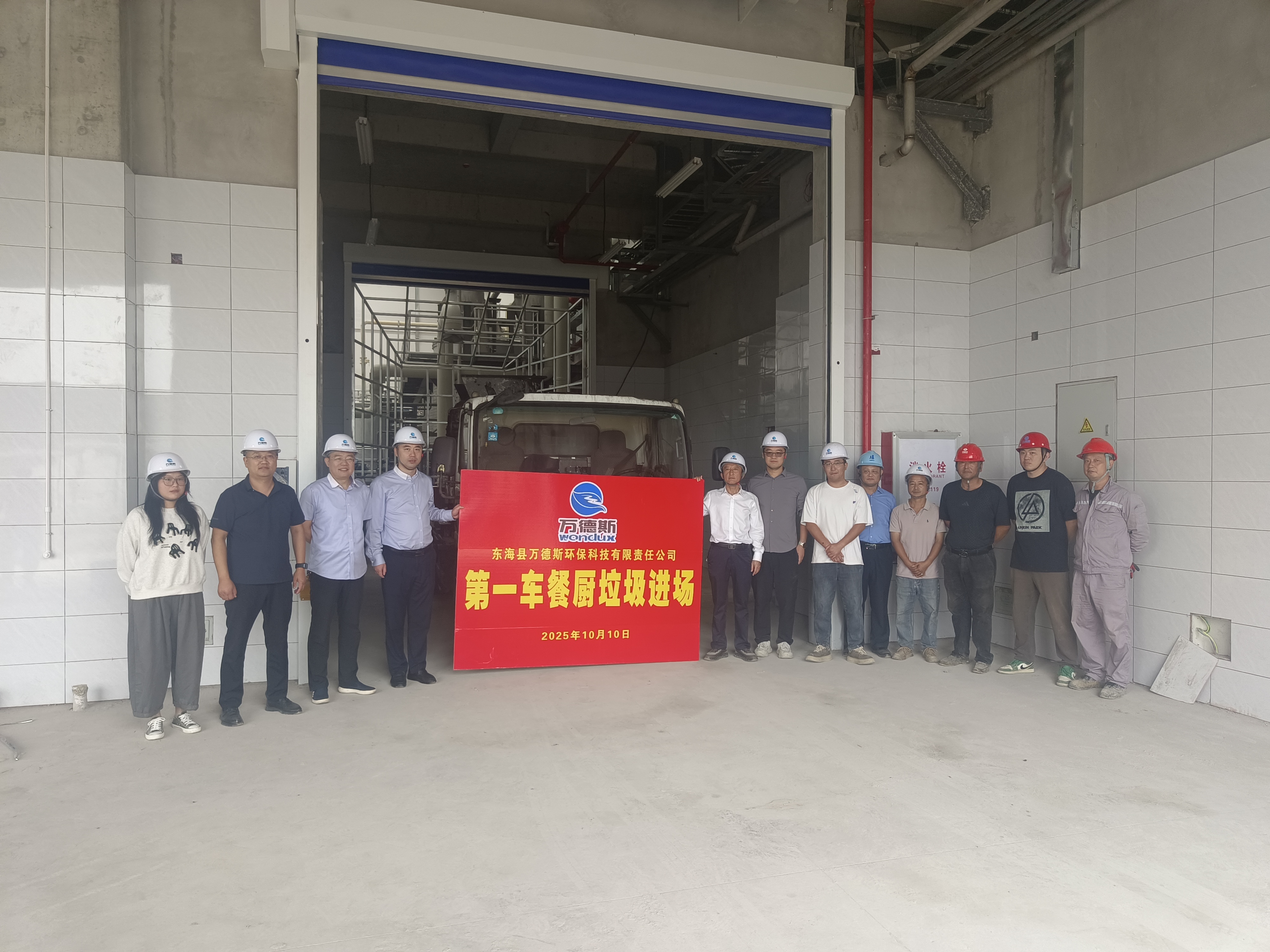 10月10日上午,东海县餐厨废弃物处理项目现场传来关键进展——首辆满载餐厨垃圾的收运车在预处理车间顺利完成卸料,标志着由东海县万德斯环保科技股份有限责任公司负责实施的该项目,正式进入进料调试试运行阶段,我县餐厨垃圾处置自此实现“合理化、规范化、积极化、无害化、资源化”的重要突破。
