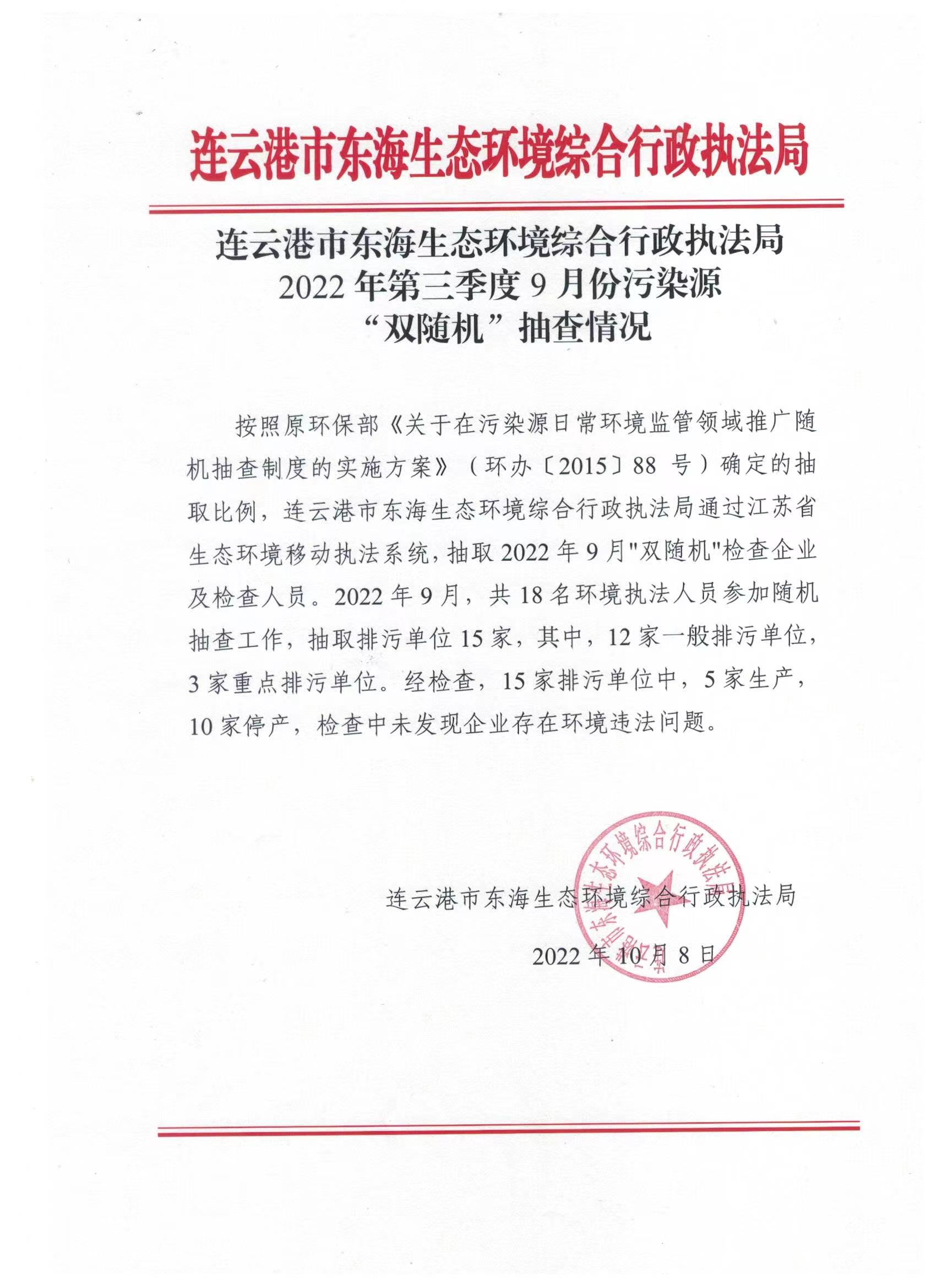 连云港市东海生态环境综合行政执法局2022年第三季度9月份污染源“双随机”抽查情况