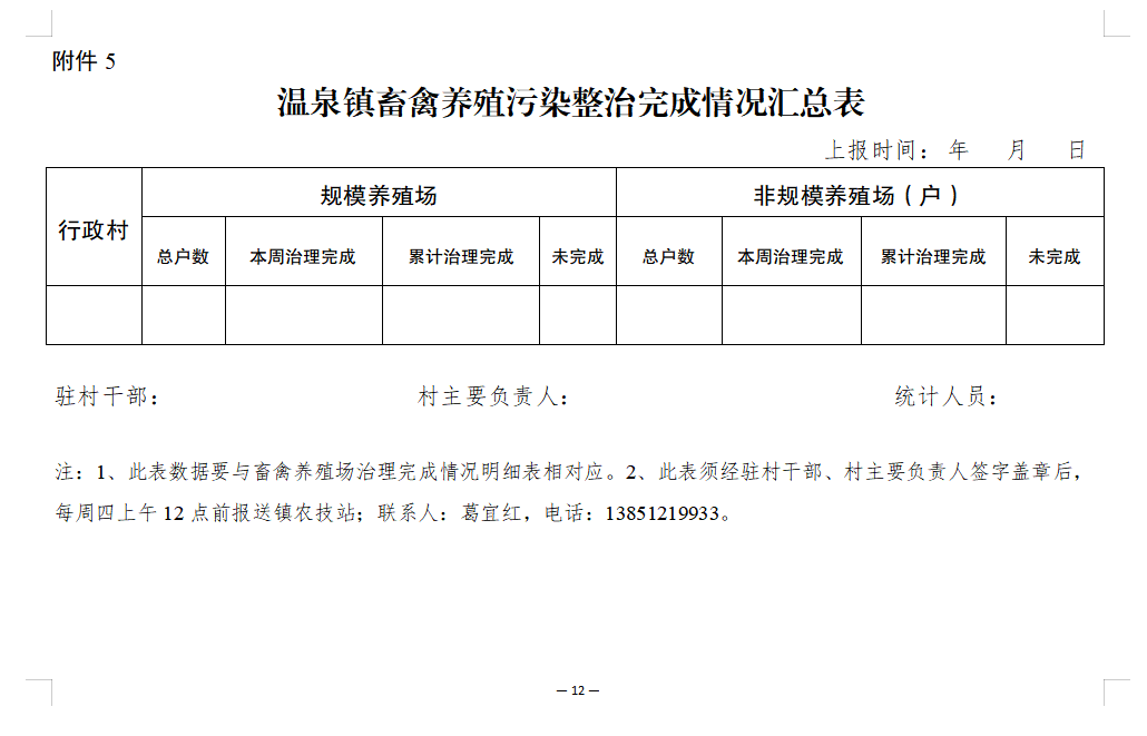 (二)强化信息上报。各村要明确专人负责畜禽养殖污染专项整治联络员统计工作,于每周四上午12点前上报畜禽养殖污染整治完成情况明细表、汇总表至领导小组办公室。