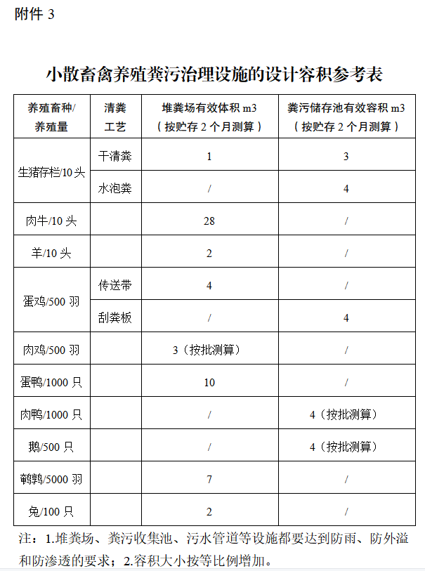 3.小散畜禽养殖粪污治理设施的设计容积参考表、粪污处理设施示意图